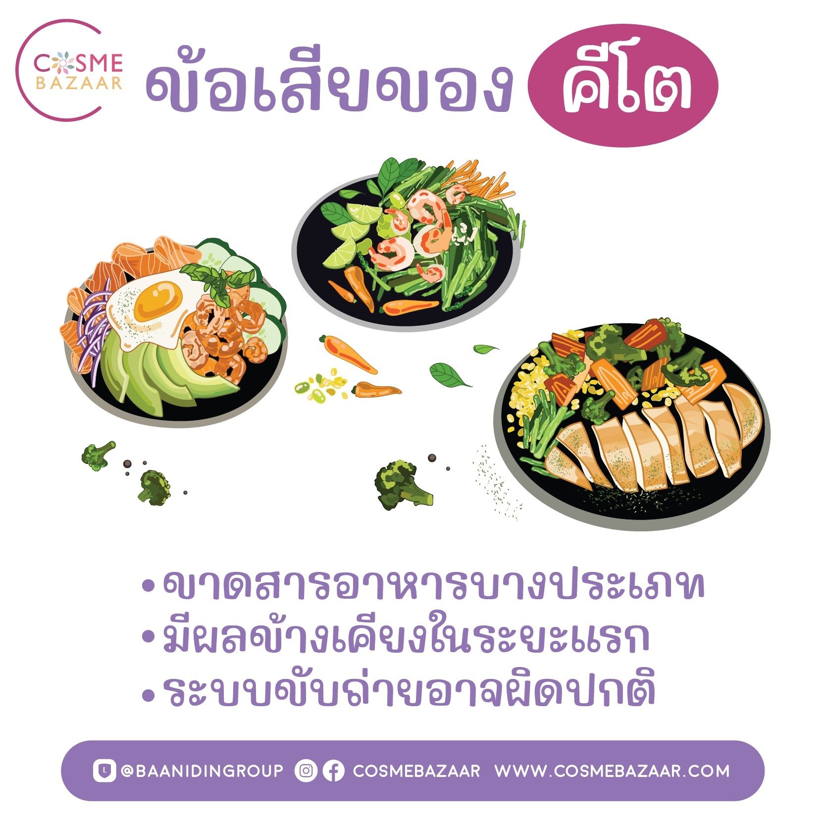 ขาดสารอาหาร เนื่องจากชาวคีโตไม่สามารถกินอาหารบางประเภท เช่น ผักและผลไม้บางประเภท อาจทำให้ขาดวิตามินและสารอาหารต่างๆ ดังนั้นชาวคีโตจึงต้องมีการเสริม เกลือแร่ และวิตามินให้แก่ร่างกายด้วยเมื่อกินคีโตเป็นระยะเวลานานๆ