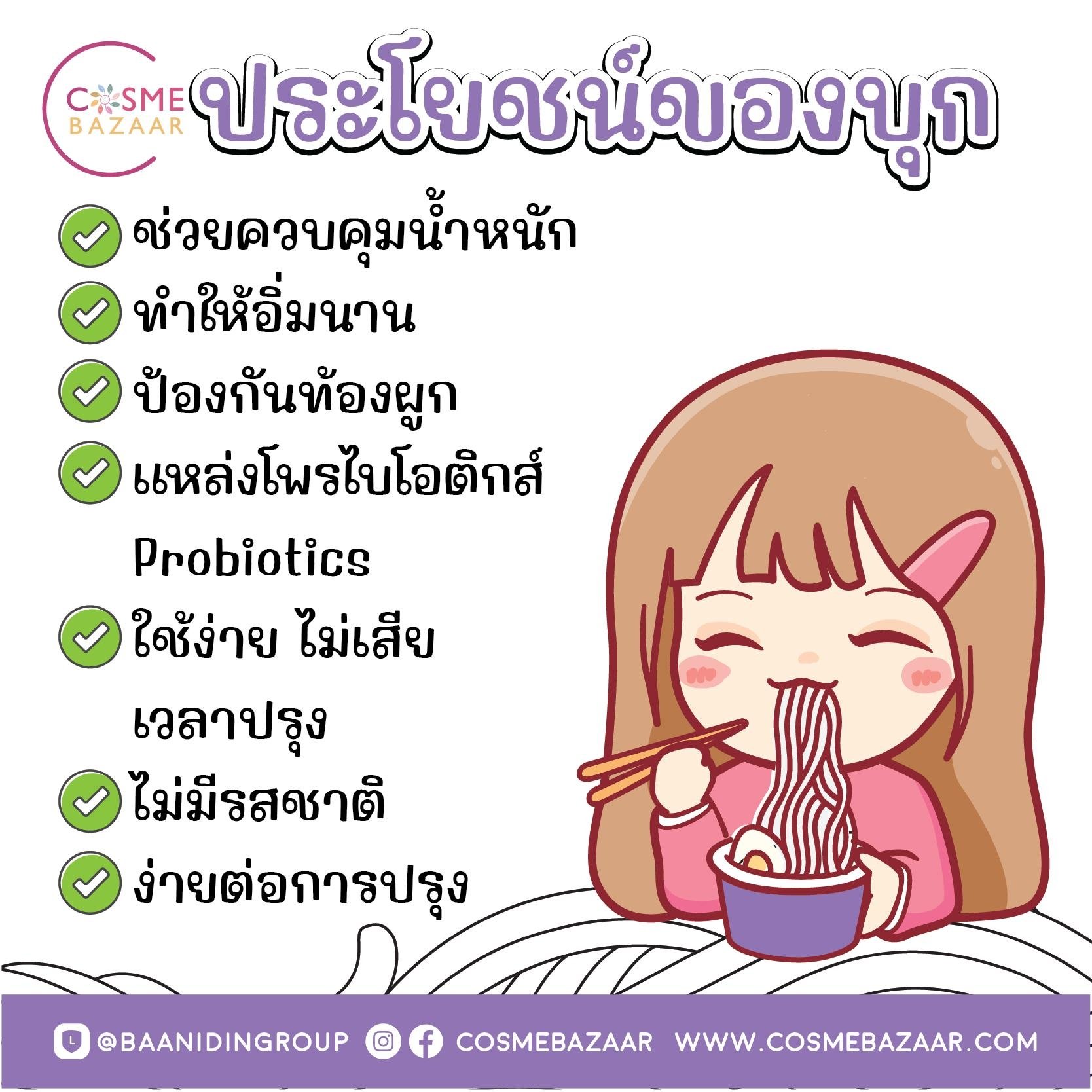 · ช่วยควบคุมน้ำหนัก เนื่องจาก บุกมีคาร์โบไฮเดรตต่ำ ให้พลังงานน้อย จึงนิยมกินเส้นบุกแทนข้าว สำหรับคนที่ต้องการลดน้ำหนัก