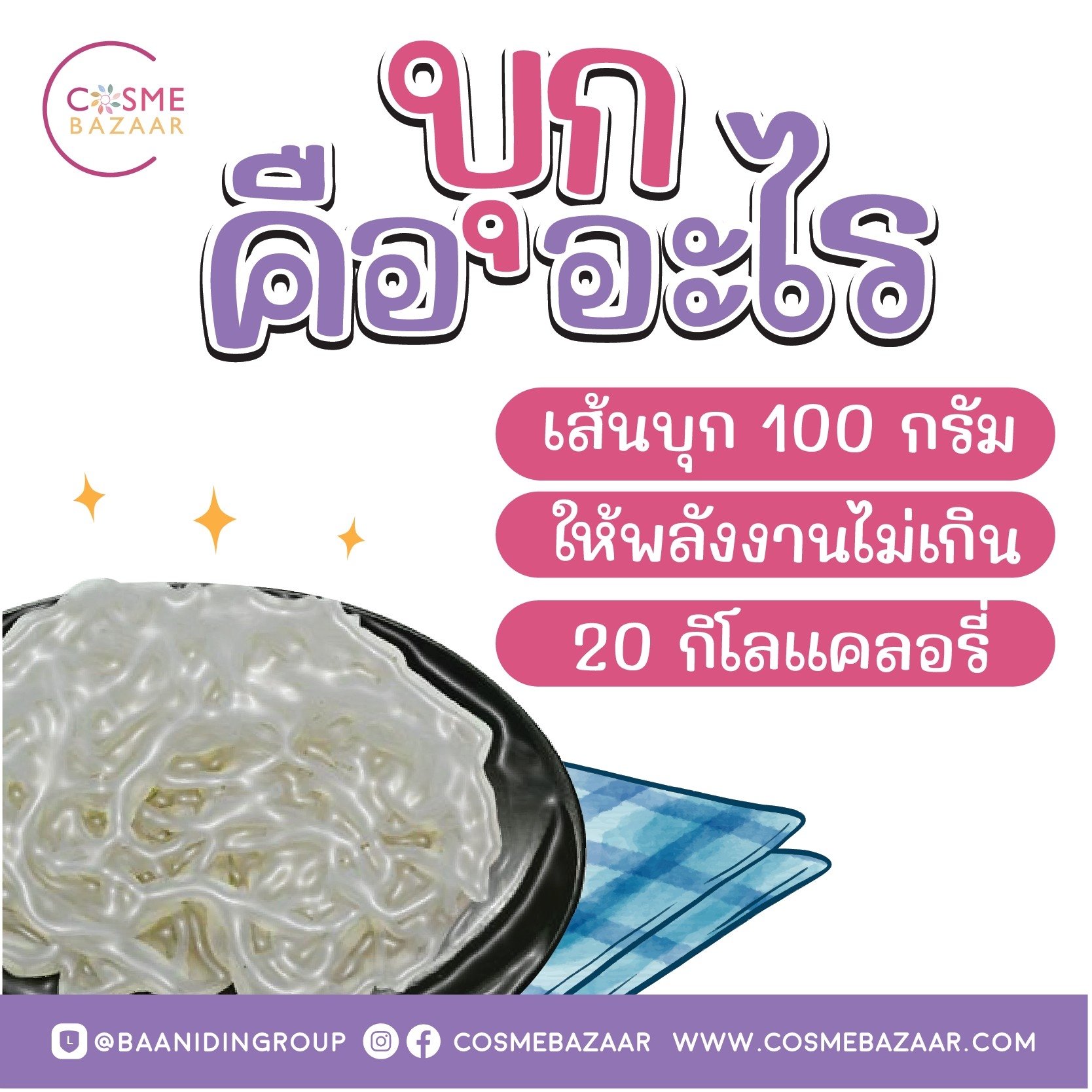 บุก หรือเส้นบุก แปรรูปมาจาก หัวบุก ซึ่งเป็นไม้ล้มลุก อยู่ใต้ดิน ในบุกมีสารสำคัญ คือ กลูโคแมนแนน ซึ่งเป็นคาร์โบไฮเดรตชนิดหนึ่ง ประกอบด้วย กลูโคส แมโนส ฟรุตโทส จัดว่าเป็นสมุนไพรชนิดหนึ่ง การนำบุกมากินมีกรรมวิธีที่ค่อนข้างยุ่งยาก แต่ในปัจจุบันได้มีการแปรรูปให้สามารถนำมาประกอบอาหารได้ง่ายขึ้น ปกติเส้นบุก 100 กรัม ให้พลังงาน ไม่เกิน 20 กิโลแคลอรี่