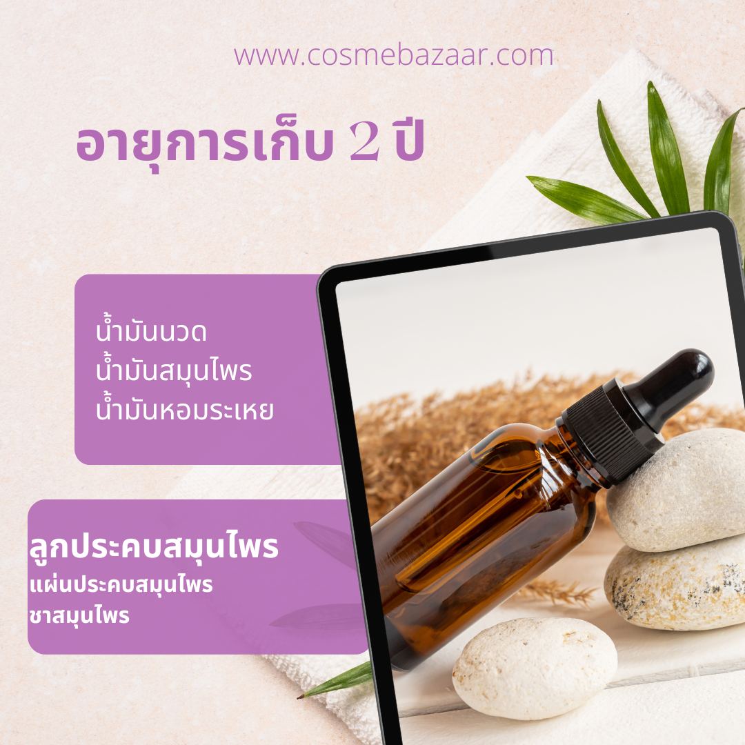 อายุประมาณ 2 ปีสำหรับผลิตภัณฑ์เป็นน้ำมันธรรมชาติ น้ำมันนวด, ลูกประคบ, แผ่นประคบสมุนไพร , ชาอาบน้ำสมุนไพร,น้ำมันสมุนไพร, น้ำมันหอมระเหยแท้ , น้ำมันหอมระเหยเบลน ฯลฯ