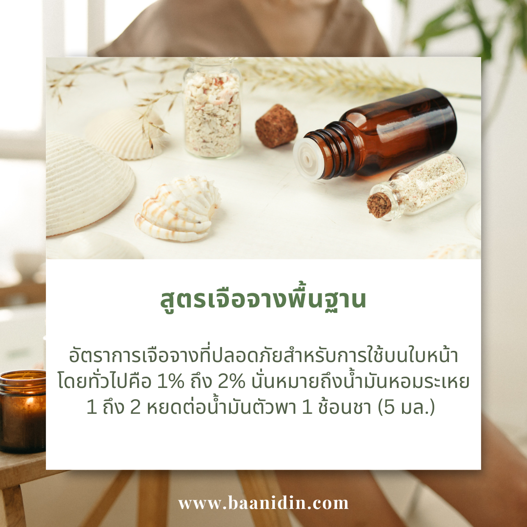 อัตราการเจือจางที่ปลอดภัยสำหรับการใช้บนใบหน้า โดยทั่วไปคือ 1% ถึง 2% นั่นหมายถึงน้ำมันหอมระเหย 1 ถึง 2 หยดต่อน้ำมันตัวพา 1 ช้อนชา (5 มล.) เช่น น้ำมันสวีทอัลมอนด์ ซึ่งเหมาะสำหรับผู้ใหญ่ส่วนใหญ่ สำหรับผิวแพ้ง่าย การเจือจาง 0.5% (หรือน้อยกว่า) อาจเหมาะสมกว่า โดยเท่ากับน้ำมันหอมระเหยประมาณ 1 หยดต่อน้ำมันตัวพา 2 ช้อนชา (10 มล.)